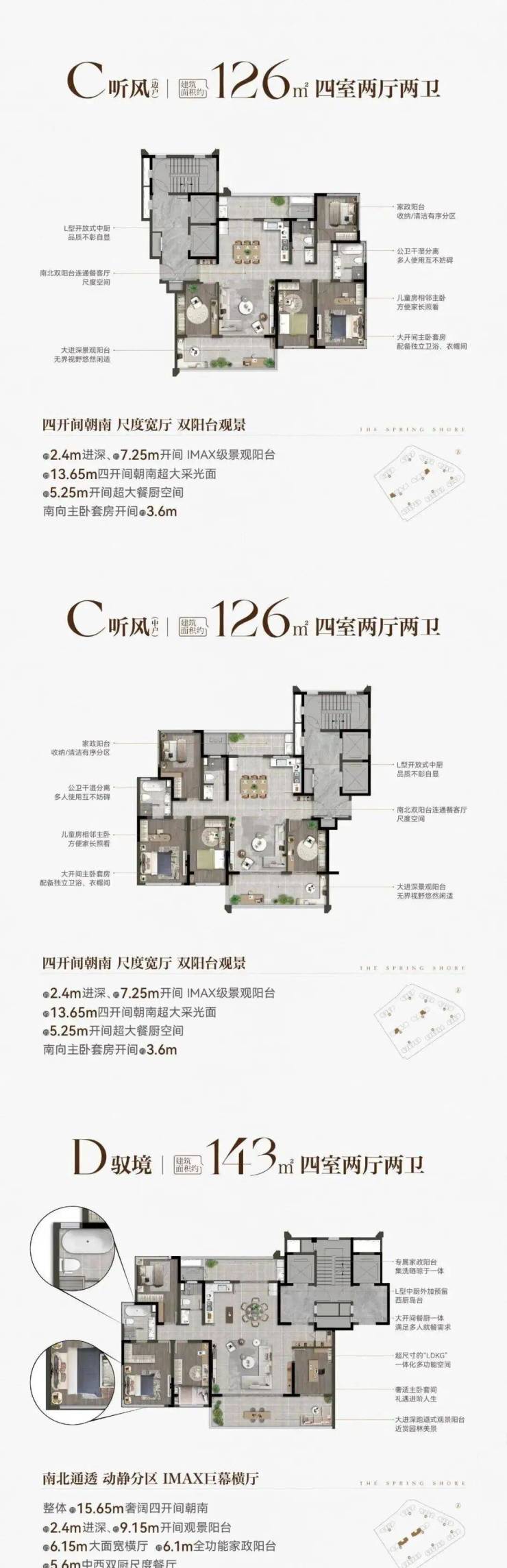 项目规划建筑面积约103-238㎡改善户型,层高最高约3.05m,南北通透、双景观阳台、南向多面宽,于一方宽境里,满足对阔绰空间与舒适格局的拥享。