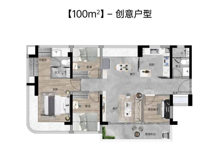 建面约100㎡户型为横厅布局,南北对流更加通透。