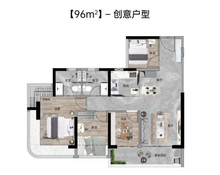 建面约96㎡户型在80㎡户型的基础上新增了一个多功能房,可以布置成书房、休闲房、储藏室,家庭成员多的话用作卧室也完全不成问题,满足多元化的需求。