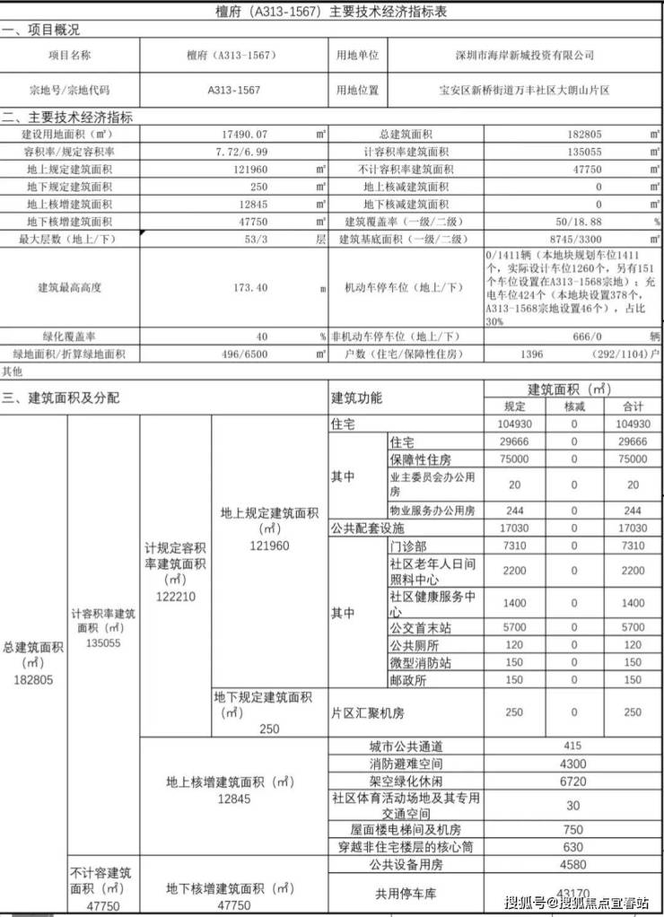 规划建设3栋(48-53层)超高层住宅,总户数1396户,其中保障房1104户,普通商品房住宅292户,机动停车位1411个。