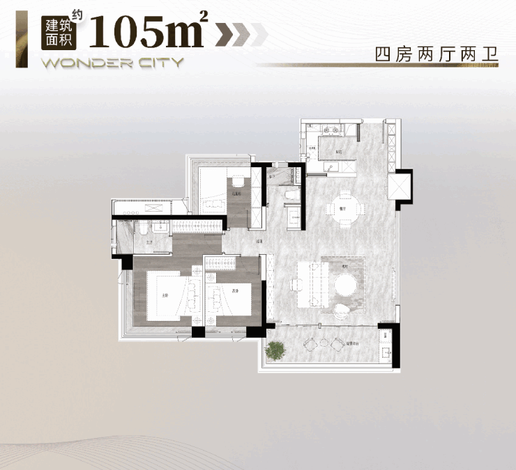 建面约105㎡户型,四房两厅两卫;