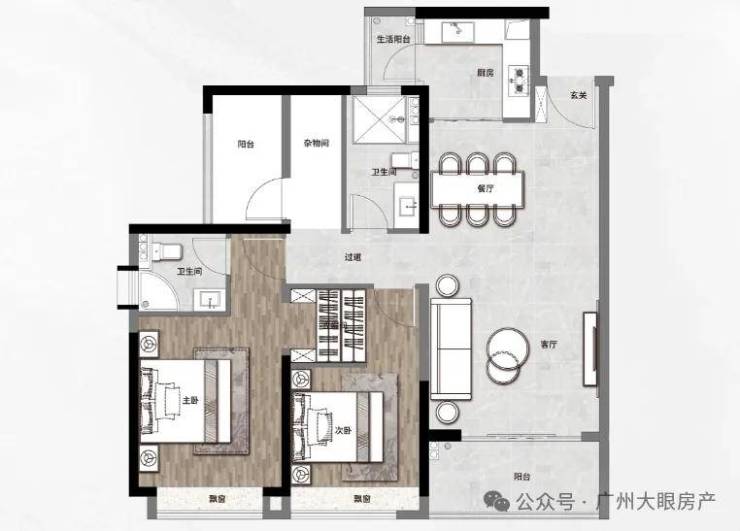 超6m超宽景观阳台,享大夫山湖头排景观; 全屋飘窗面积全赠送,双阳台面积半赠送,实用率超80%
