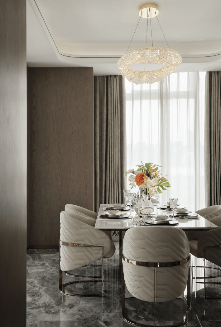 开放的客餐厅打破桎梏,餐桌选择了金属与石材结合的独特设计。在完美的采光环境下,让每一次品尝美食的过程也充满仪式感。水纹座椅呼应房间临江主题,让浮动的波纹化为稳固的装饰,承托住和家人一起分享的美好回忆。