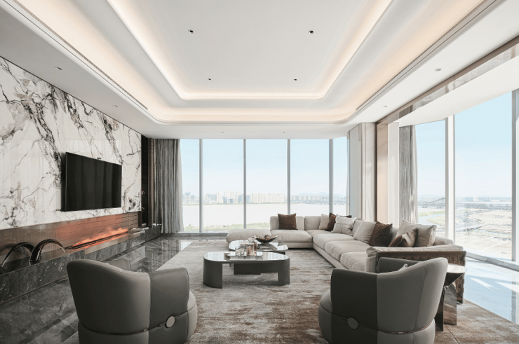 全球前50位顶尖设计师之一,连续三次荣膺室内设计奥斯卡奖室内设计上,采用LDK一体化设计,带来极具阔正的空间尺度,并以大面米灰、暖灰为主基调,营造出高级优雅的氛围感,同时通过吊灯、艺术玻璃、酒柜等软装艺术作点缀,将艺术与生活融合,简奢中透出时尚前卫,营造出私密、温暖、现代化、国际化及独特的鼎级舒居体验。