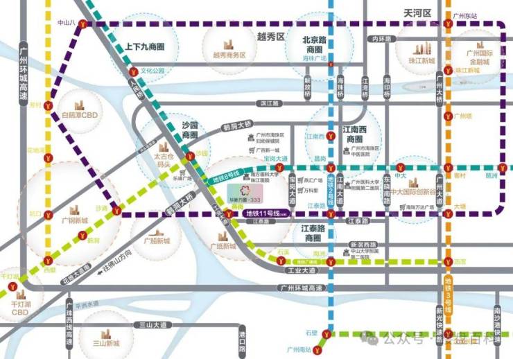项目位于广州市海珠区工业大道- 工业大道中333号,地铁广佛线与广州地铁11号线交汇站燕岗站D出口上盖;规划海珠创新湾片区广纸新城的核心区域,是广州智能应用中心与广佛体验消费商圈,未来将打造粤港澳大湾区智能中心、珠三角西岸高端配套服务基地、广佛高品质休闲生活港湾和广州文化产业基地。