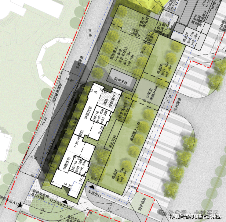 整体沿和平大道一字排开,总户数239户。其中1、2号楼整体为南北朝向,南向偏西约30°;3号楼为南向偏东朝向。1、2号楼1-2层为架空设计,3号楼1-2F、4F为架空层,3F规划为公交场站。