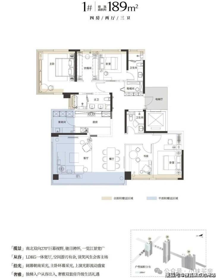 1号、2号楼东侧靠近和平大道为149平户型,西侧3-15层为153㎡;16层及以上为189㎡看江房源;3号楼为146㎡、153㎡和189㎡户型组合。