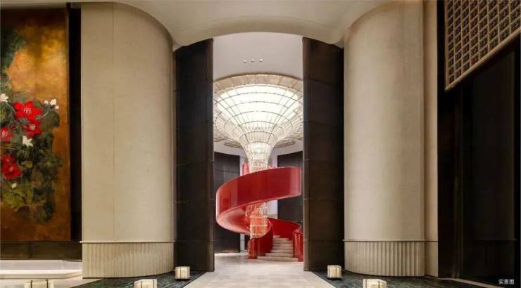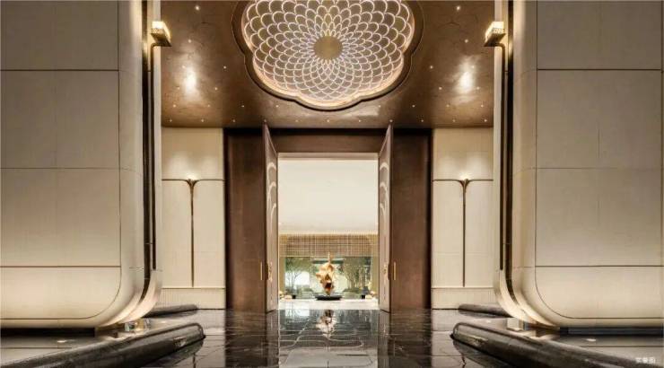两吨重约7.5米高鎏金铜门,由我国国宝级非遗大师朱炳仁先生锻造,其中,铜金件上雕琢的凤鸟纹样,则取自北京保利艺术博物馆馆藏的海内孤品——周王鼎。步入此境,心绪于文明中穿梭,大家威仪自此展开。