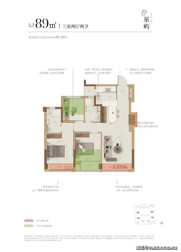 三开间朝南,南向面宽约9.65米,餐厅带“S墙”可嵌入冰箱,整体空间几乎没有任何浪费,完全可以容纳三口之家舒适居住。孩子小的时候,北面的书房可以作为孩子的玩具兴趣房,待孩子稍大,则用作孩子的学习房,灵活满足家庭成长需求。