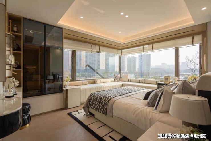 主卧更是直接升级为L型270度的飘窗,是市面上做转角飘窗里的最小户型。作为常见于豪宅才有的设计,这里三房户型也有,买到就是超值。