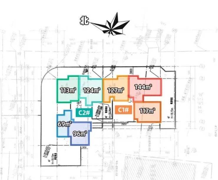 C1栋主推东向144㎡、127㎡,其中144㎡的主卧朝南,CI栋还有西向的117㎡户型。两栋住宅相连,C2户型分为东向的124㎡及113㎡、南向的96㎡、北向的69㎡。