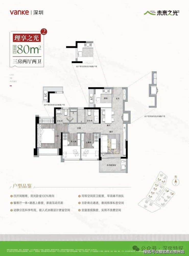 6、户型设计不错,别的开发商80平这个面积段只能做三房一卫,万科做到了三房两卫,功能性立马提升