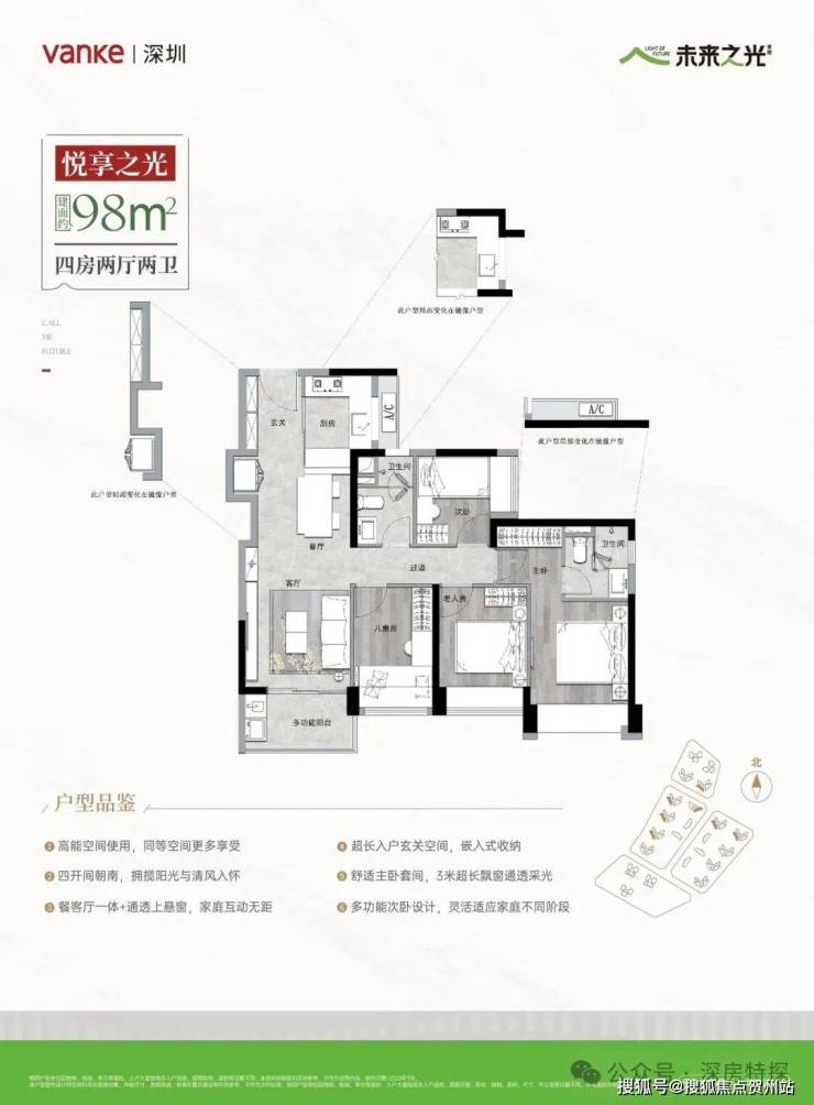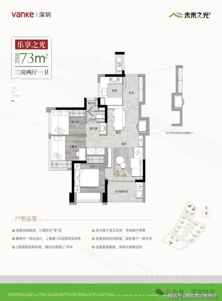 1、户型设计,73㎡可做三房一卫,80㎡做三房两卫,98㎡做四房两卫,这面积段和户型一看在深圳项目里是很稀缺的,看似面积小实际上因为小高层的设计,使用率是不输于市面上的其他产品的。
