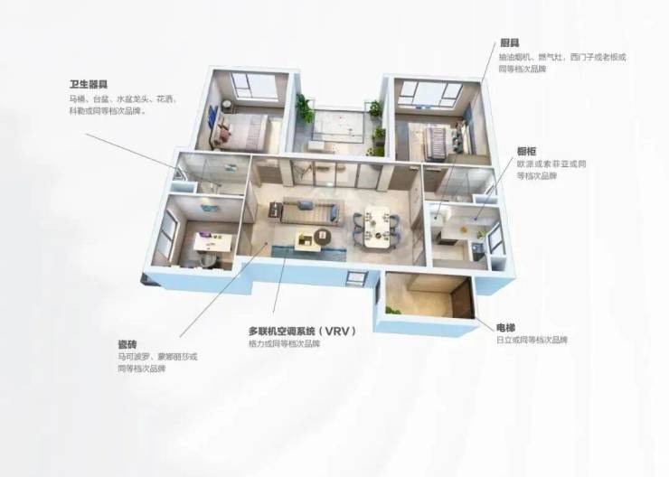 臻选科勒、马可波罗、蒙娜丽莎、格力、西门子、老板、欧派、索菲亚、日立等国内外知名品牌或同等档次品牌,臻造品质居家空间(最终以商品房买卖合同为主)。