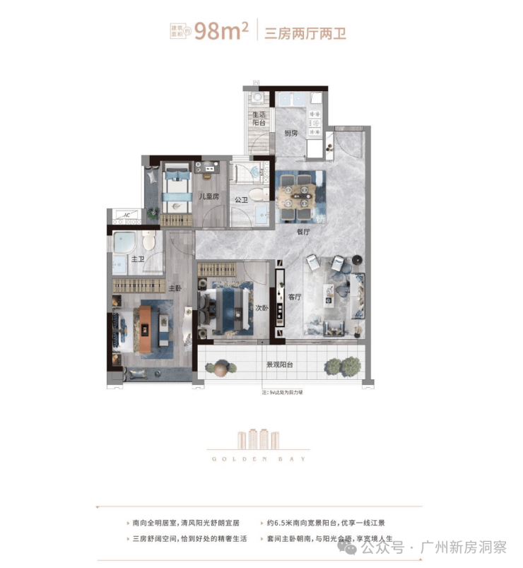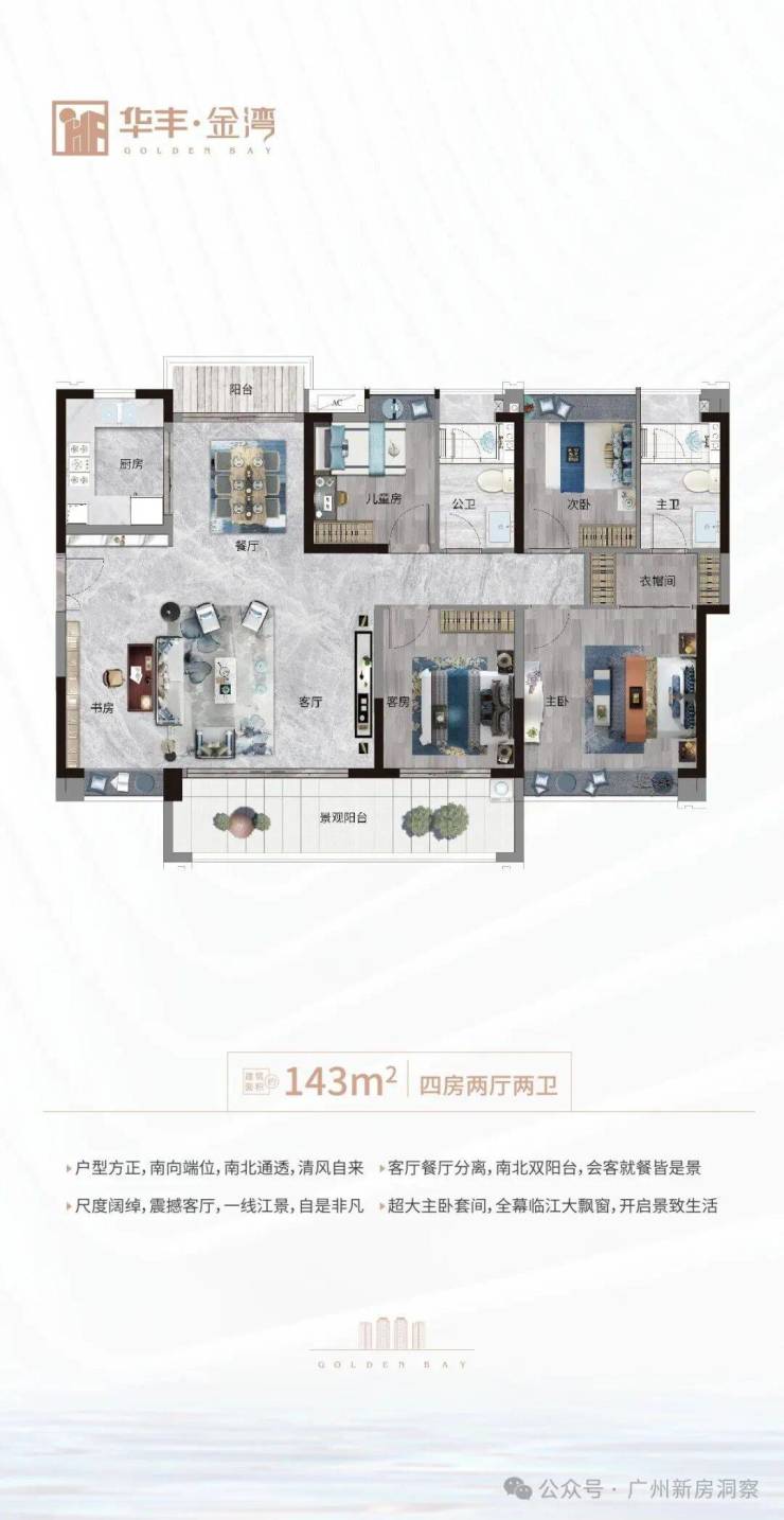 华丰·金湾由深圳房企华丰世纪集团开发,占地约3.8万平,计容建筑面积约12.7万平,容积率2.5,绿化率35%,规划建设5栋23-30层高层建筑、12班幼儿园及商业配套;项目主打建面约98~125平的精装修户型,此外也有更大户型,价格现低至2.5万元/平;项目总户数约500户,车位880个华丰·金湾是灵山岛目前在售的唯一南向望江项目,拥有稀缺的一线江景资源;前无遮挡的视野,让业主能够尽情眺望对岸的横沥岛美景。