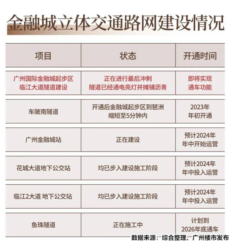 除此之外,在强劲的发展引力驱动下,广州金融城车陂南隧道已在去年年初开通,开通后约5分钟即可从金融城起步区通行至琶洲;同时鱼珠隧道也在全力施工中,计划到2026年底通车;起步区的花城大道地下公交站、临江大道地下公交站均已步入建设施工阶段,将于今年年中投入运营。