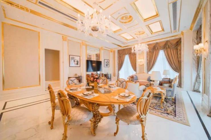 无论比例的和谐、材质的昂贵还是工艺的精度,都与欧美纯正的新古典顶豪相距甚远。比如,泥金吊顶涂的是漆,大花壁纸真的是“纸”