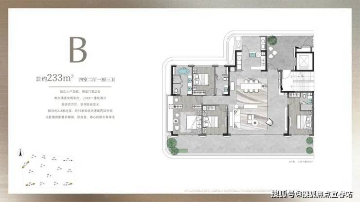 约 233㎡四室二厅一尉三卫:独立入户花园,尊崇门第之仪,南北通透全明采光,LDKB 一体化设计,游式方厅自由定义空间,约 2.4 米进深、约 919 米阳台连南向目开间,主卧房配置衣帽间、双台盆。