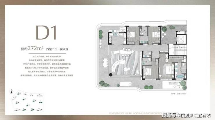 约 272㎡四室二厅一四卫:独立入户花园,约 21 米南面宽南向四开间进阶光新,IMAX 广角采光,开放式泪港方厅尽显家族排场,悬挑约 2.4 米 & 270° 环形阳台四季诗意如画,双儿童房相邻又独立,顶级主卧房步入式衣帽间双台盆配置。