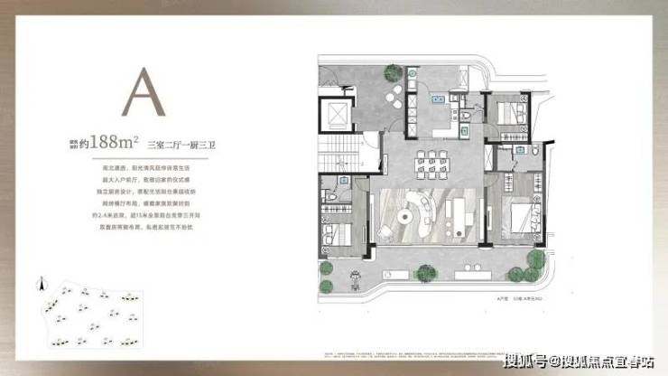 约 188㎡三室二厅一厨三卫:南北通透,超大入户前厅彰显归家仪式感,独立房带生活阳台,绰横厅布局,约 2.4 米进深、超 15 米全素用台贯穿三开间,双营两侧布局保障私密起居。