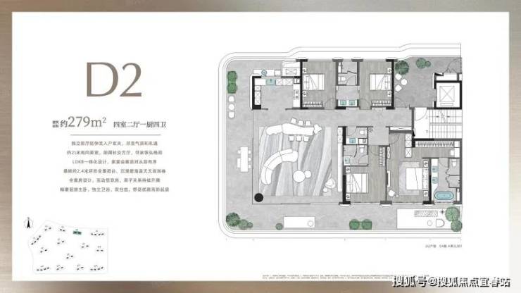 约 279㎡四室二厅一四卫:独立前厅延伸入户玄关,约 21 米南面宽朗间社交方厅世家弘格局,LDKB 一体化设计家宴会客从容,约 2.4 米环形全景阳台沉醉海天之间,全食房设计互动型双房提升亲子关系,私密主卧独立卫浴、双台盆优雅高阶起居。