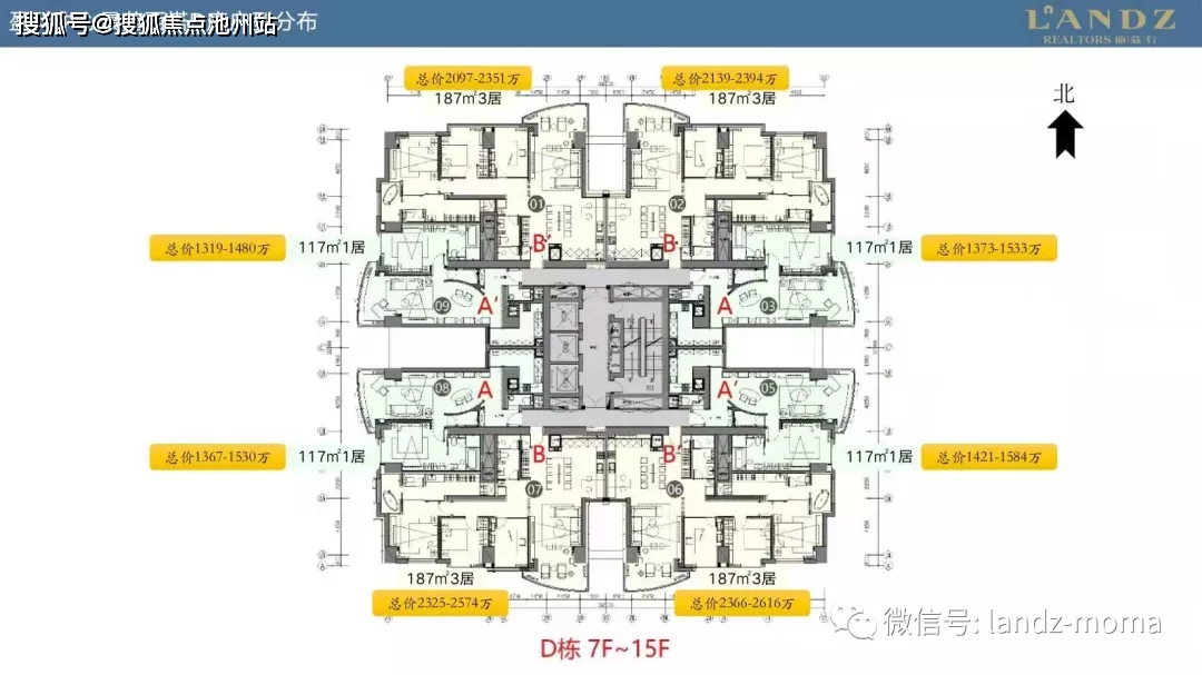 D座:层高3.15米,7-15层在售,3居室187户型(西南向,或者其它角,2面采光,带明卫),1居室118户型(东向或者西向)