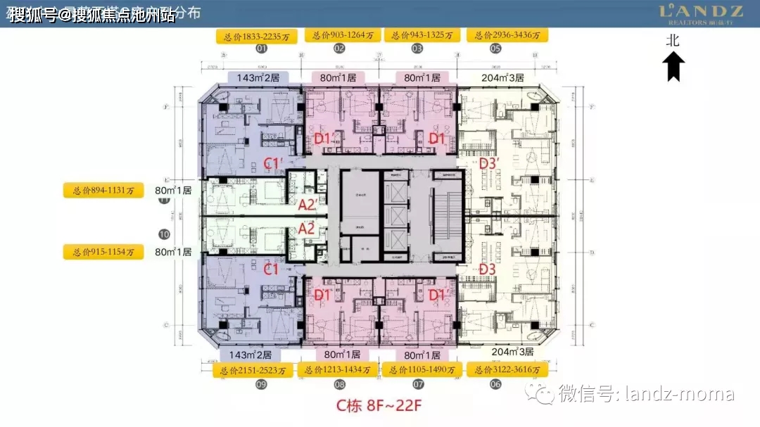 C座:层高3.4米,5-22层在售,3居室204户型(东南向或者东北向),2居室143户型(西南向或西北向),1居室80户型(南向或者北向),开间80户型(西向)