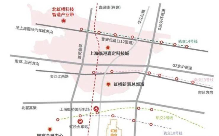 江桥镇地处嘉定、普陀、闵行、长宁四区交汇处,陆轨空三位一体,嘉闵高架、沪宁高速公路、外环线等穿越而过,轨交13号线、14号线、嘉闵线等3条轨道交通线共同构成了四通八达的交通网络,是承接上海与长三角城市群“同城效应”最直接的区域之一。