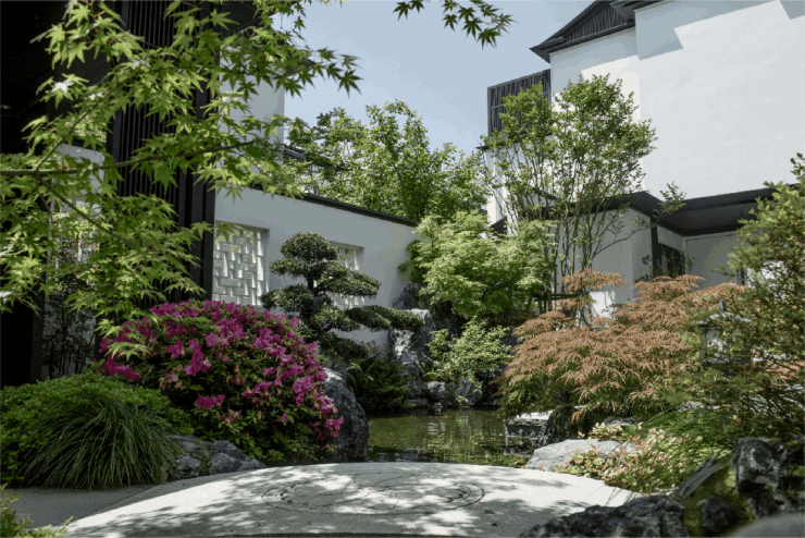 当你独坐露台或室内,玻璃幕墙、栏杆,丝毫不会影响你的景观视野;独门独户的院子里,有煮茶空间、 花道空间等,饮茶、插花、下棋或会客,可满足文人雅士般的归隐生活;当你徜徉在巷道里,两道深墙之间, 一条树木掩映下的林荫夹道上,偶遇一块精致的石头、一棵精致的树,转头又能看见一扇樱花点缀的花窗画景......