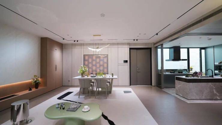 一进玄关,中轴为庭,串起厨房、餐厅、客厅及阳台,构成一个家庭交流的超级广域公区。约40㎡超大方厅样板间实景图
