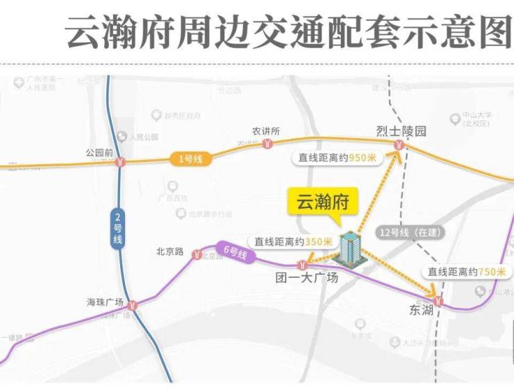 以云瀚府为中心,1公里步行范围内,遍布越秀顶配城市资源:约350米,就是地铁6号线团一大广场站,1站北京路、6站珠江新城,你的生活半径,延伸至全城。