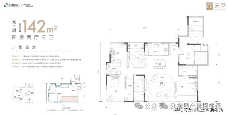 建面约142平户型也是四房两厅三卫: