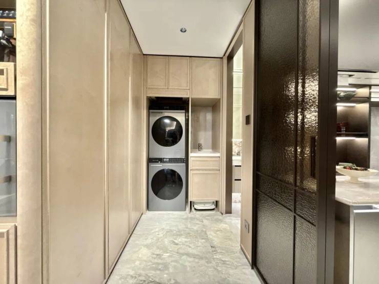 收纳升级:长约3.4米的整墙收纳柜+玄关收纳柜、家政柜配置单独洗涤盆等升级收纳配置!