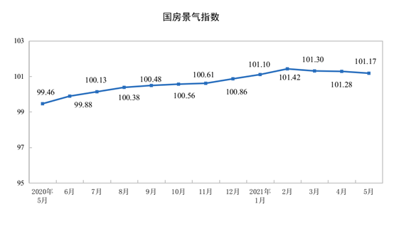 5月份,房地产开发景气指数(简称“国房景气指数”)为101.17。