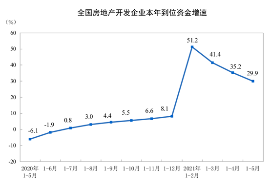 1—5月份,房地产开发企业到位资金81380亿元,同比增长29.9%;比2019年1—5月份增长22.0%,两年平均增长10.5%。其中,国内贷款10873亿元,增长1.6%;利用外资25亿元,下降26.5%;自筹资金22686亿元,增长12.8%;定金及预收款31738亿元,增长62.9%;个人按揭贷款13400亿元,增长32.0%。