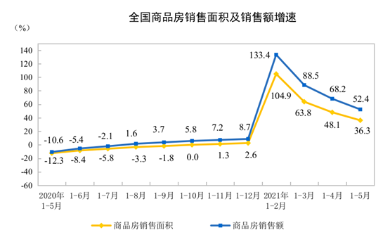 1—5月份,商品房销售面积66383万平方米,同比增长36.3%;比2019年1—5月份增长19.6%,两年平均增长9.3%。其中,住宅销售面积增长39.0%,办公楼销售面积增长10.5%,商业营业用房销售面积增长8.2%。商品房销售额70534亿元,增长52.4%;比2019年1—5月份增长36.2%,两年平均增长16.7%。其中,住宅销售额增长56.5%,办公楼销售额增长24.9%,商业营业用房销售额增长10.3%。