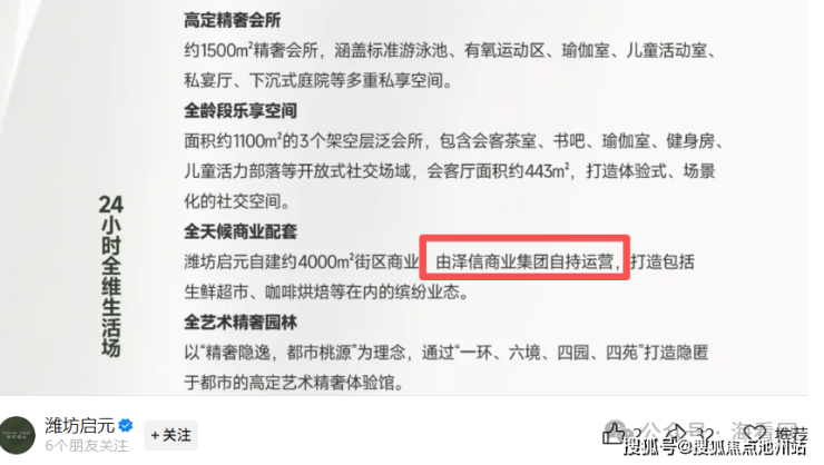 需提醒,在项目的官方微信公众号可看到,社区的商业由泽信的商业公司进行自持运营,但未提及健身房、瑜伽室、泳池等配套后期的运营计划。建议购房时询问清楚具体的运营方式、收费模式等。
