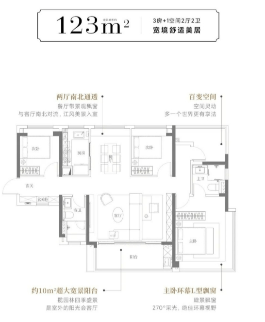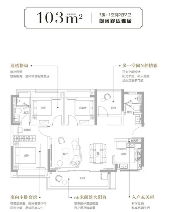 建面约103平的3+1房在整个片区来说相对稀缺。该户型采用横厅设计,同时自带约6米宽阳台,空间尺度可以和120平以上的大户型一较高下。