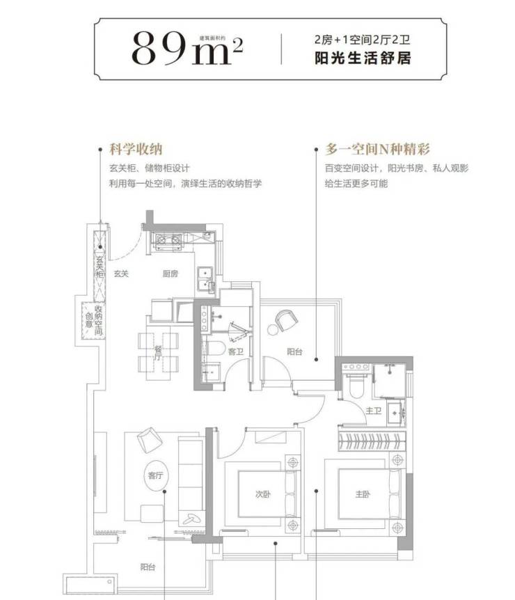 建面约89平的2+1房通过小面积控制低总价,是不少刚需买家的心仪选择。值得一提的是,该户型在做到客餐厅一体的同时,还能实现三开间朝南,通风采光应该不错。
