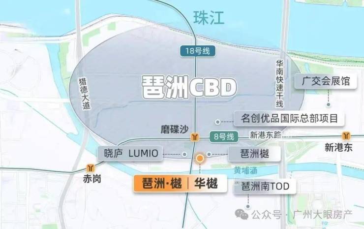 最近的地铁,还是琶洲西区最核心、8/18号线双线交汇的磨碟沙地铁站,仅隔着一条新港东路,直线距离约200米。