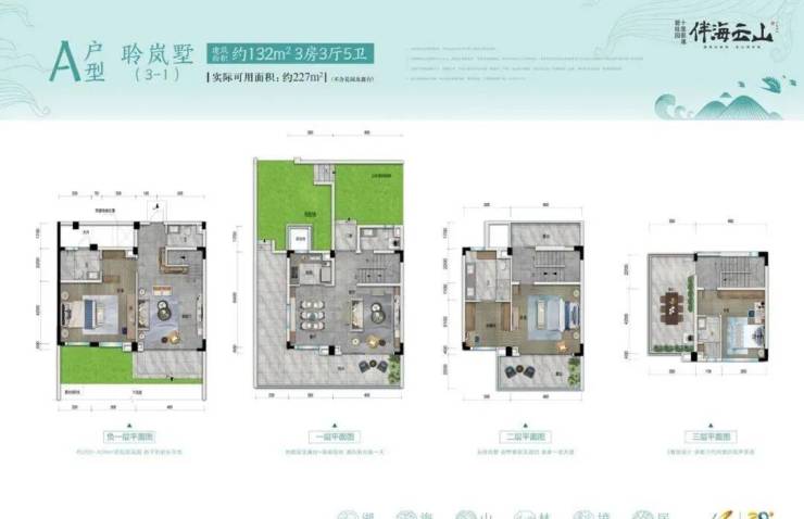 聆岚墅A户型:建筑面积约132㎡,实际可用面积约227㎡(不计花园及露台)