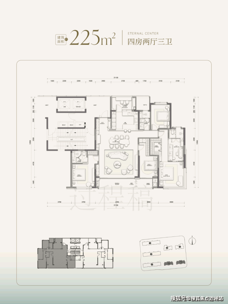 户型方面,目前高层户型图过程稿已出,起步户型为位于南侧两幢建面约225㎡四房两厅三卫的南厅户型。