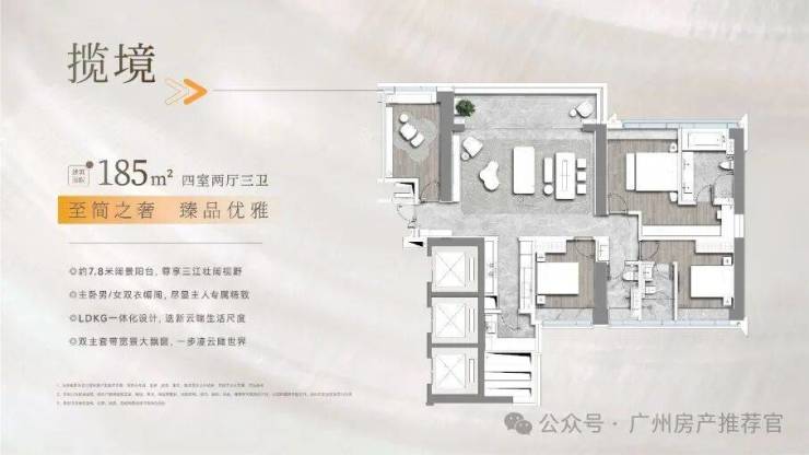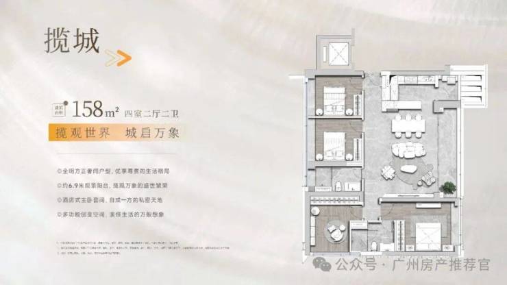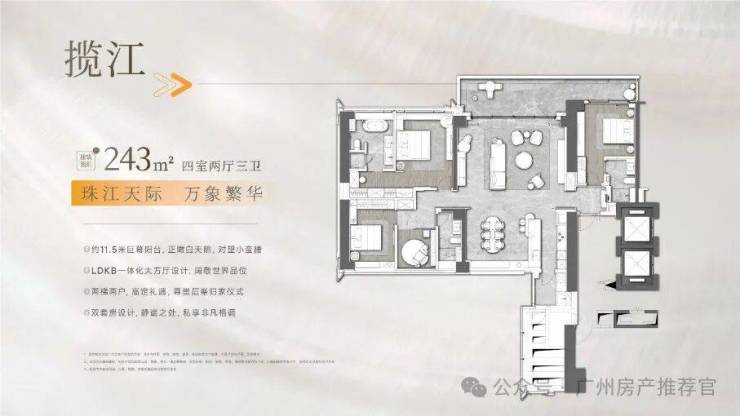 30层面向珠江的楼王户型。它拥有3.3米建筑层高、11.5米宽的超大阳台和2个面向珠江的无敌景观卧室套房,整个珠江前后航道最精华的部分尽收于此。