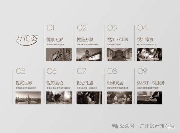 「万悦荟」整合多元业务领域,联手行业领先国际品牌,为业主带来系统化、定制化的全新滨江万象生活方式,包括:悦享无界、悦鉴万象、悦江·CLUB、悦江家宴、悦览世界、悦知品位、悦心礼遇、悦伴友居、SMART·悦服务9大权益。