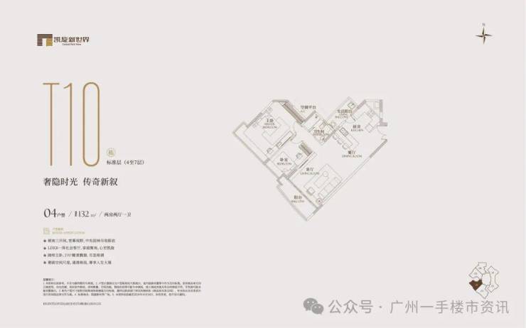 凯旋新世界广粤观邸雄踞广州珠江新城 CBD 东区核心,是新世界中国打造的顶豪标杆,也是珠江新城唯一兼具一线江景、中央公园、纯居住低密的国际人居地标,以「江园双景・顶豪圈层」重新定义广州塔尖居住标准。项目总占地约 11 万㎡、总建面约 29 万㎡,容积率 2.9、绿化率 44.5%,规划 24 栋高层,纯大户型、无小户型干扰,圈层纯粹。产品主打建面约 132-304㎡2-5 房,货量仅约 100 套,层高 3.3 米奢阔尺度,户户南北通透、大面宽观景,部分户型享270° 环幕江园双景,可俯瞰珠江、广州塔、猎德大桥,以「城央顶豪」尺度,匹配珠江新城塔尖精英圈层。