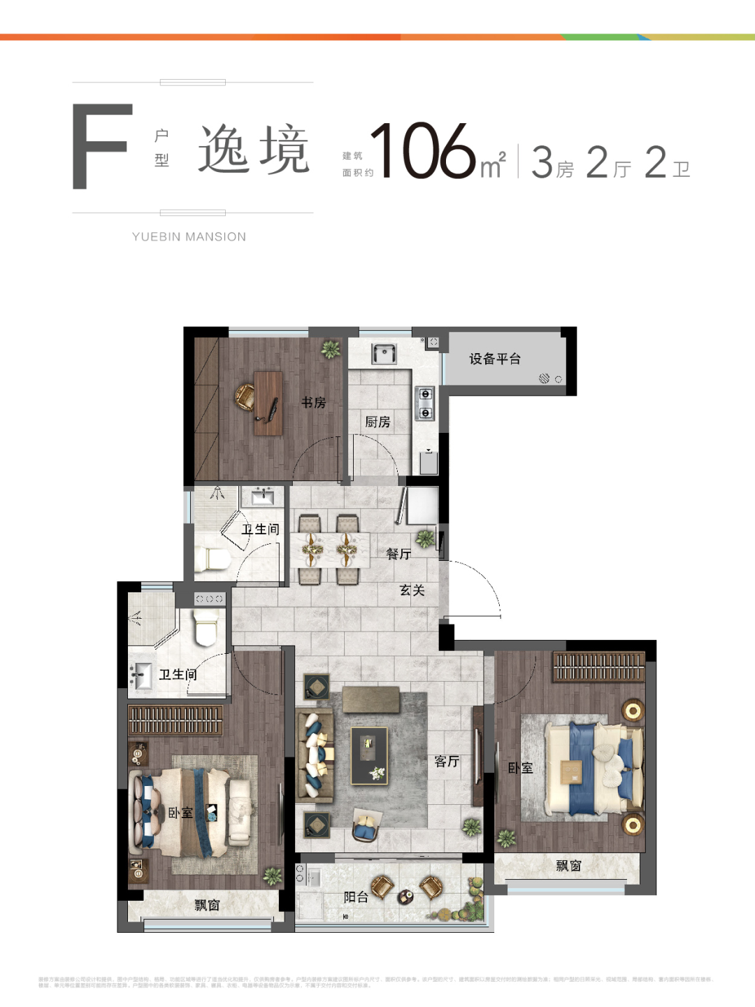 建面约106㎡三房两厅两卫的户型表现也不差。各个空间尺度阔绰;双卧室都设计有飘窗,舒适度优质;书房尺度良好,稍加改造即可成为一间卧室。