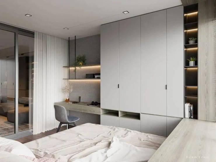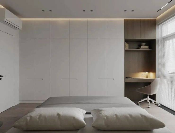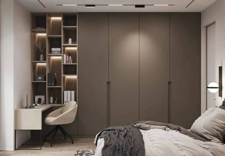 当家里没有独立的书房,又想保证一个安静的环境,承载独立思考空间,都会把书桌放在卧室里。但一个独立的书桌占的位置也不小,所以将衣柜和书桌做成一体化的设计是最能节省空间的。而且因为色调风格保持统一,也不会有突兀和不协调的感觉。
