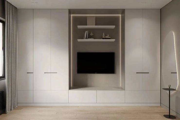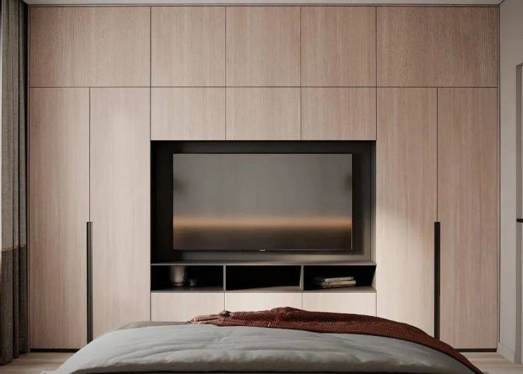对于宽度较大的卧室,在床的侧边无法安放衣柜的时候,就可以考虑在床尾布置衣柜。但是这样的布置会让卧室略显拥挤与压抑,如果能在衣柜中间留个电视柜的位置,这样整个卧室会显得更加宽敞大方。