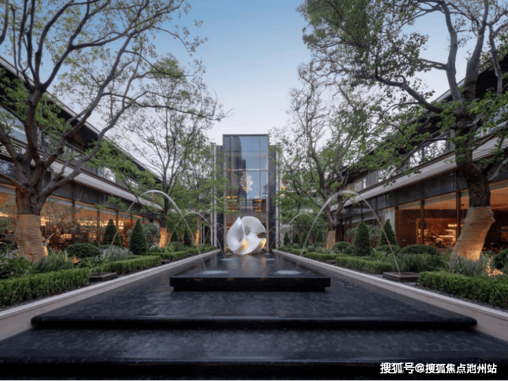 "一轴五园、一栋一花园"的生态画卷徐徐展开。中庭园林以西班牙故宫“阿尔罕布拉宫”为灵感,列阵跳泉与幻影蓝水台,以富有节奏的水景序列营造出仪式感;乌桕、油橄榄等全冠名木错落,四季成景,让每一次归家都宛如步入静谧与诗意交织的度假奢境。