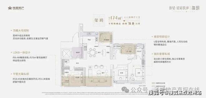 建面约174㎡户型,则是另一种气场。约18.45米南向四开间,配上约70㎡的豪宅级横厅,站在客厅里就能感受到什么叫“空间的奢侈”。